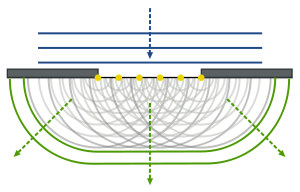 Дифракция или огибание радиоволной различных препятствий соизмеримых с длиной волны, к примеру, для диапазона 2,4 ГГц длина волны составляет 12,5 сантиметров, для 5 ГГц это уже около 6 сантиметров. Согласно принципу Гюйгенса электромагнитная волна распространяется сферическим фронтом, при этом граница любого препятствия становятся вторичными источниками фронта излучения. Огибающая фронтов волн всех вторичных источников становится фронтом волны в следующий момент времени, при этом результирующее электромагнитное поле в каждой точке пространства будет определяться интерференцией этих волн.