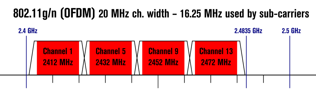 В диапазоне 2.4 ГГц существует 3 непересекающихся канала шириной 20 МГц, на рисунке ниже выделены жирной линией: