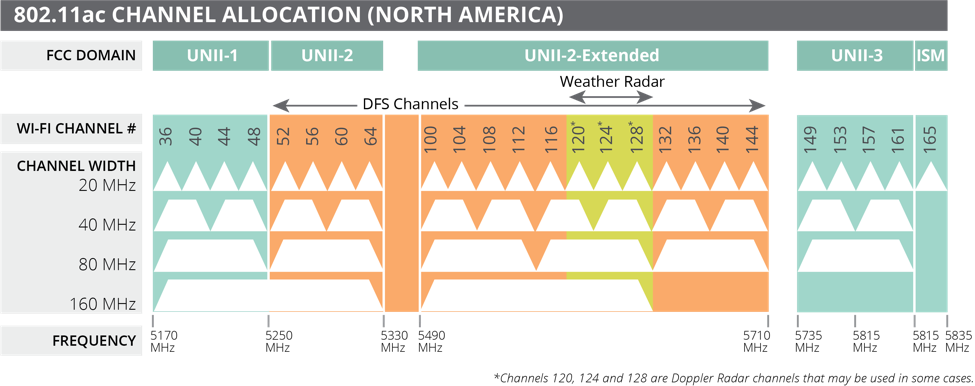 В диапазоне 5ГГц частотных каналов значительно больше, если не принимать внимание ограничения, накладываемые законодательствами разных стран получается 25 каналов шириной 20МГц или 12 каналов шириной 40МГц или 6 каналов шириной 80МГц или 2 канала шириной 160МГц:
