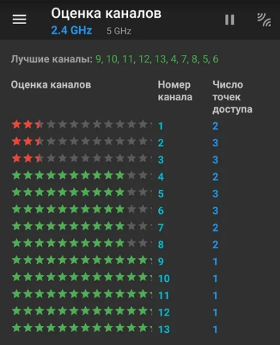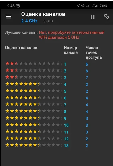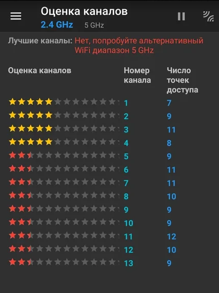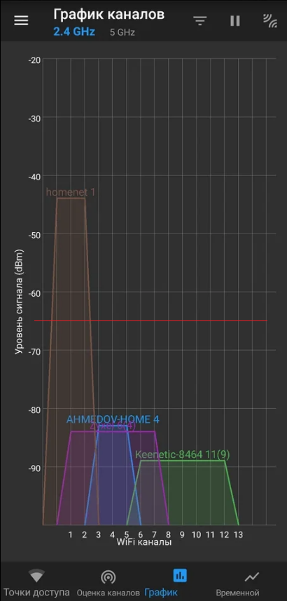 Такой же вывод делает и WiFi Analyzer совершенно спокойно рекомендуя нам 11 и 6 канал, хотя на последнем работают 3 соседских роутера: