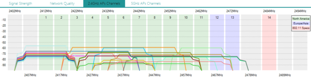 Итак, прежде чем менять роутер попытаемся забороть помеху от соседского роутера. Как мы узнали из предыдущего раздела в диапазоне 2,4 ГГц имеется 3 непересекающихся канала, для выяснения наименее загруженного канала рекомендую использовать программу WiFi Analyzer или программу для ПК Acrylic Wi-Fi Home Как правило ситуация в многоквартирных домах выглядит вот так: