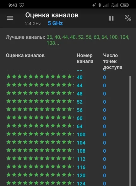 То рассчитывать на сколь-нибудь приемлемую скорость доступа в Интернет не стоит, следует воспользоваться советом купить новый роутер с поддержкой 5 ГГц. Для примера вот так выглядит загрузка каналов диапазона 5 ГГц там же: