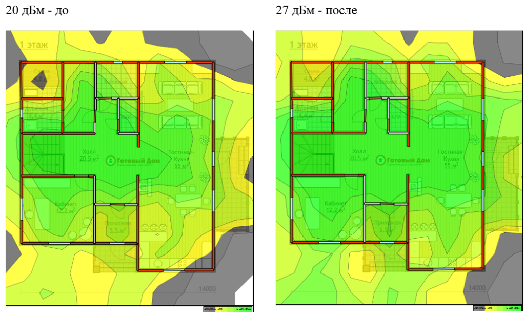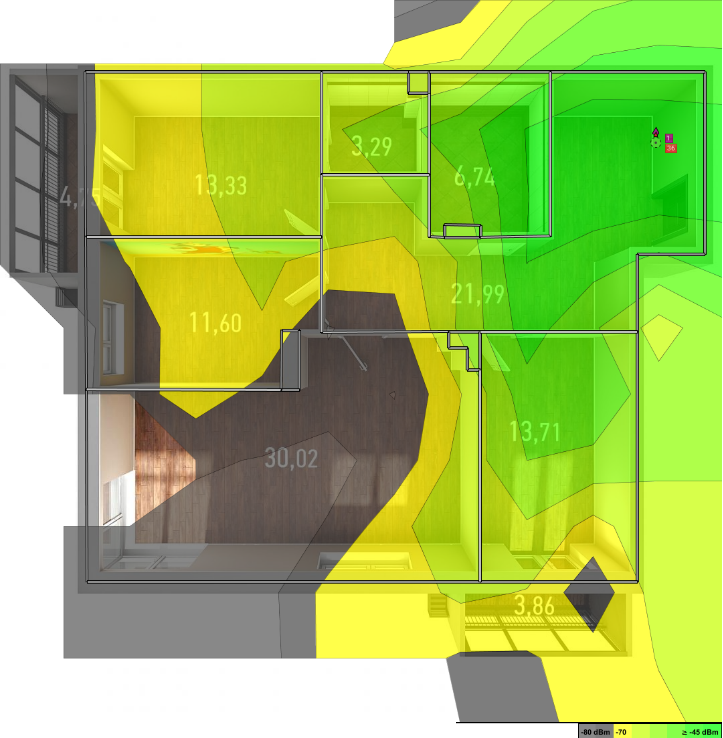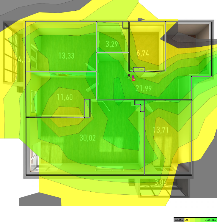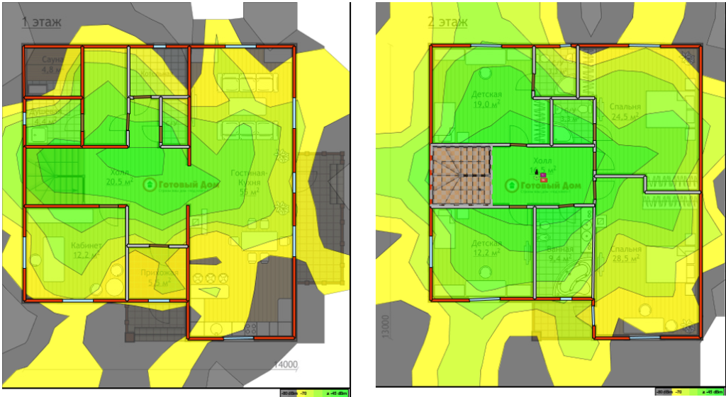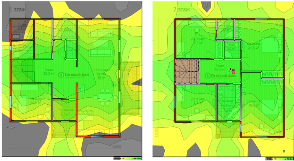 Таким образом, одного правильно установленного Wi-Fi роутера как правило достаточно для покрытия частного дома. Здесь хотелось бы обратить внимание на уменьшение зон покрытия при использовании диапазона 5 ГГц, ниже приведены расчеты покрытия для того же частного дома на 36 канале. Видно что площадь темно-зеленых зон уменьшилась, появились зоны «плохого сигнала» серого цвета с уровнем ниже -70 дБм: