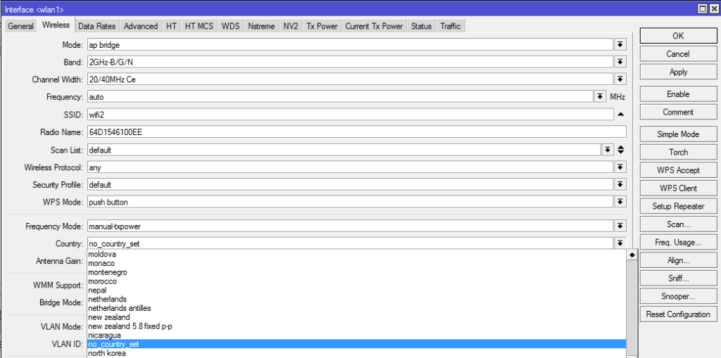На примере роутера Mikrotik hAP ac lite увеличим мощность излучения и смоделируем результирующее покрытие. В настройках Interface/wireless/wlan1 в режиме Advanced Mode выбираем no_country_set: